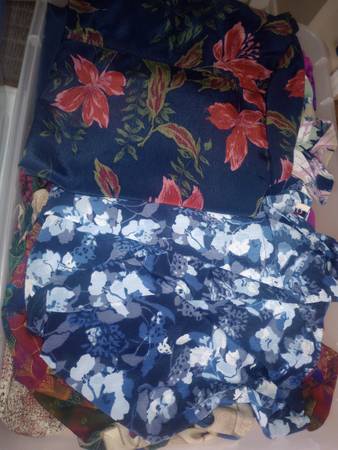 All are quality brands. Some New. All Like new, excellent condition. Worn once or twice. Perfect colors: All in tubs, see picture add $35 if you want the 6 very large storage clear plastic tubs/w/lids. Clean Fresh folded WRINKLE FREE material $300 for all. Spring Summer, Autumn, Winter colors. FRESH & CLEAN. Ready to