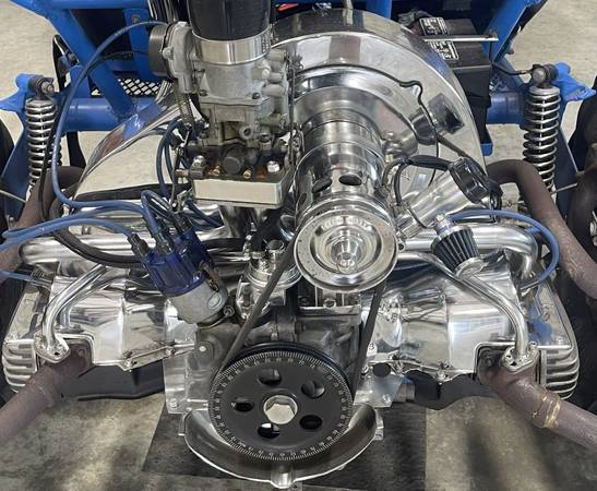 Air-cooled Volkswagen engine, Front axle, steering box, frame tunnel, rear transaxle, and engine are all from 1960s era VW