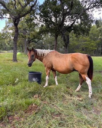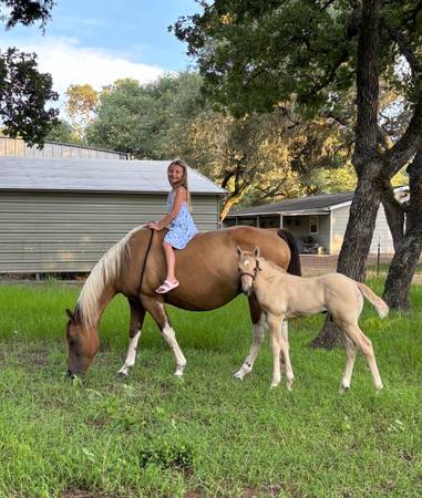 Has had 7 beautiful foals. She’s an excellent mom and has beautiful foals. She’s had palomino, buckskin tobiano, perlino (pictures of last 4 foals attached). 10/10 ground manners and easy going (loads, picks up feet, stands, all of it). Our kids hop on her out in the pasture.