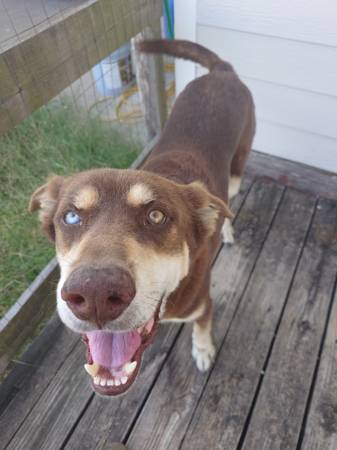 We are moving and looking for a new home for Vex. He is a 85 lbs, neutered 8 year old male Alaskan husky and chocolate lab mix. Vex has a happy and loving personality and loves to play. He is big but gentle and has never shown aggression. He always lived in a fenced in back yard, so ideally he could go to a home that has the same. We only ask for a small rehoming fee.