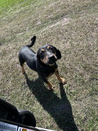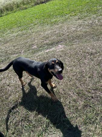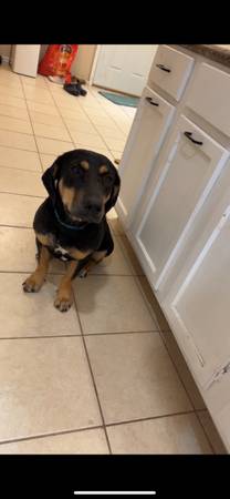 About 8 months old, spayed and potty trained. Great with kids and other dogs. Small rehoming fee to ensure good home
