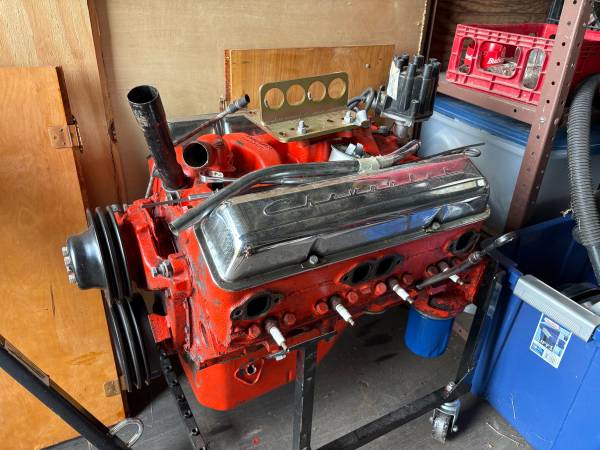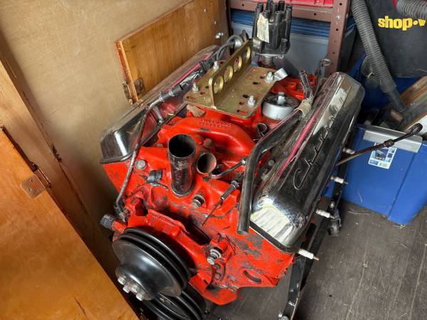 Good running engine 1966-67 Chevy V8. Including starter & factory ram exhaust manifolds. $800 cash.